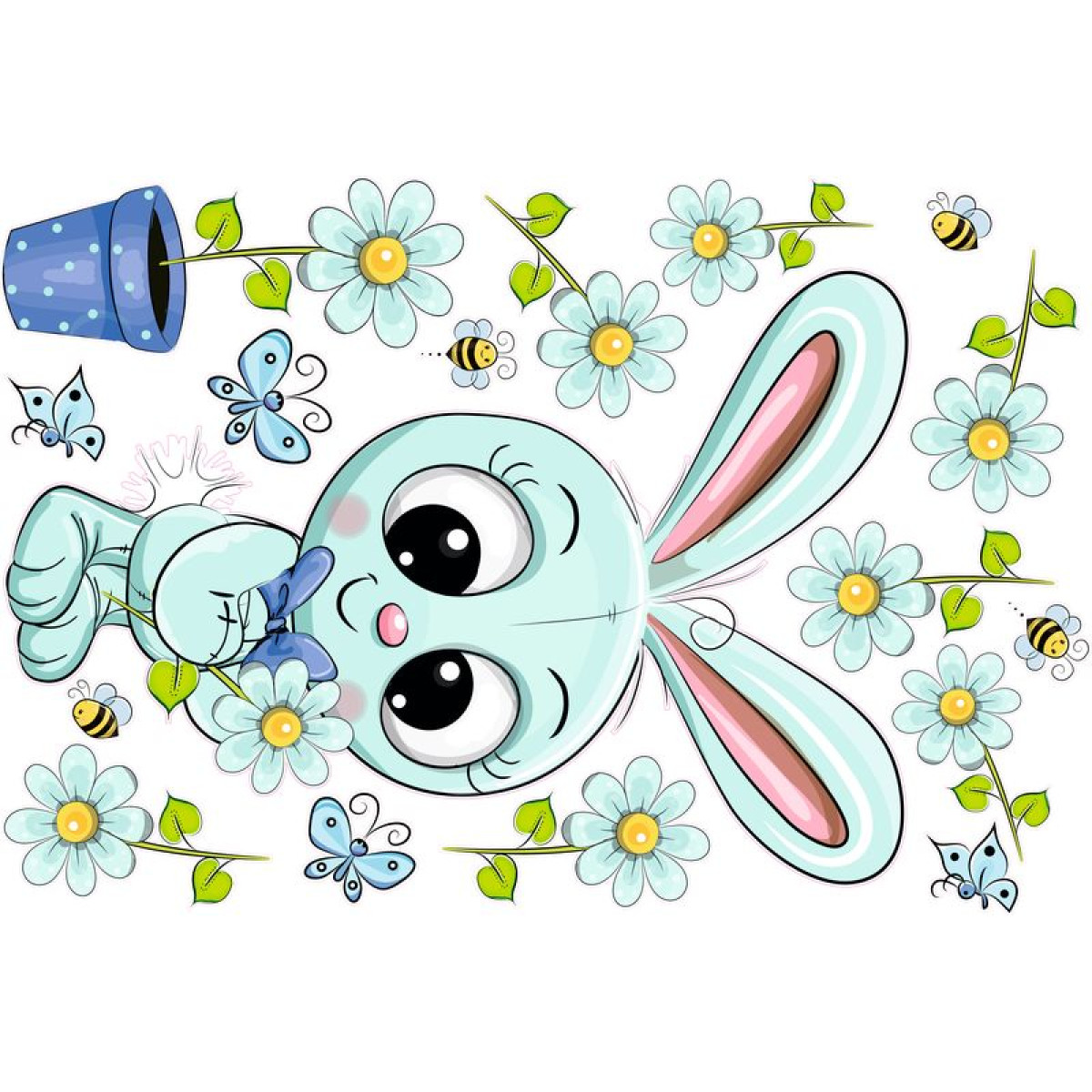 Nyuszis babaszoba falmatrica, nyuszi kék virágokkal