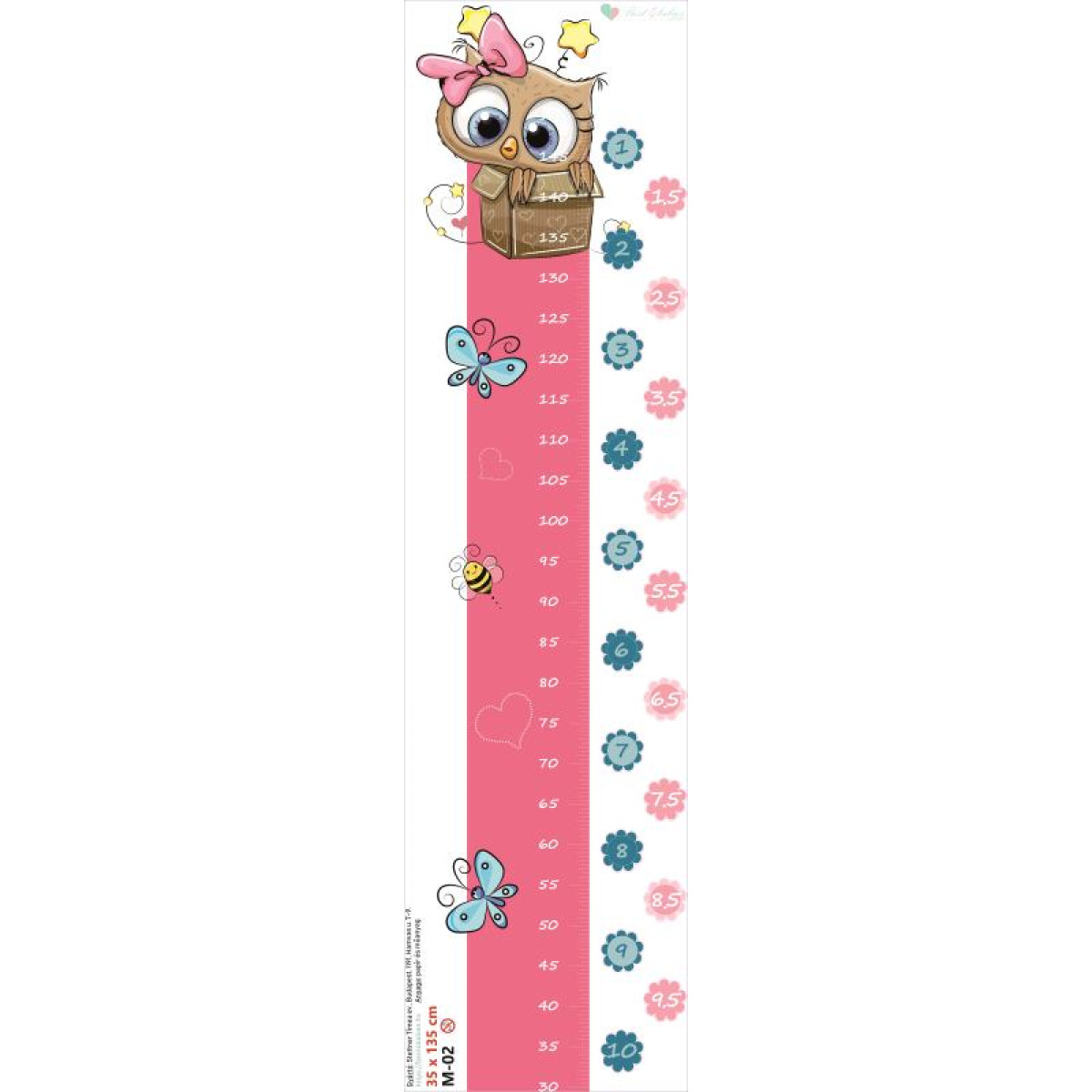 A magasságmérős falmatrica mérete 135 cm magas és 35 cm széles, ebből a mérőszalag 15 cm széles.