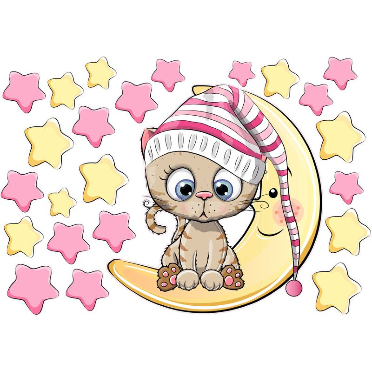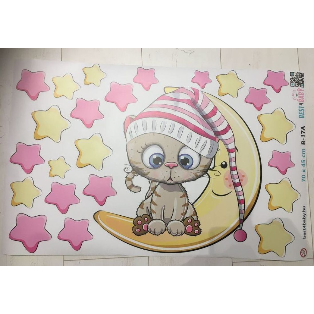 A sárga és rózsaszín csillagok és sárga hold éjszakai nyugodt alváshoz ajánljuk, nem csak a falra, de plafonra is tehető, ragasztható. A hálósapkás cica nagyon aranyos megoldása a gyerekszobának.