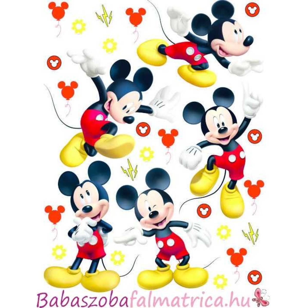 A faldekoráción 5 féle Mickey egér matrica található és egyéb piros lufi matrica, stb.. A Mickey egerek ugyanebben a mintával megtalálhatóak nagyobb méretben is az oldalunkon.
