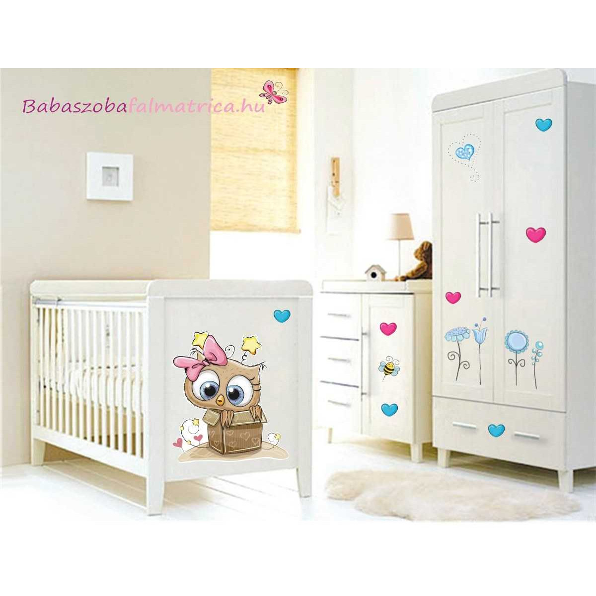 Ajándék dobozból kiugró bagoly kislány masnival babaszoba falmatrica