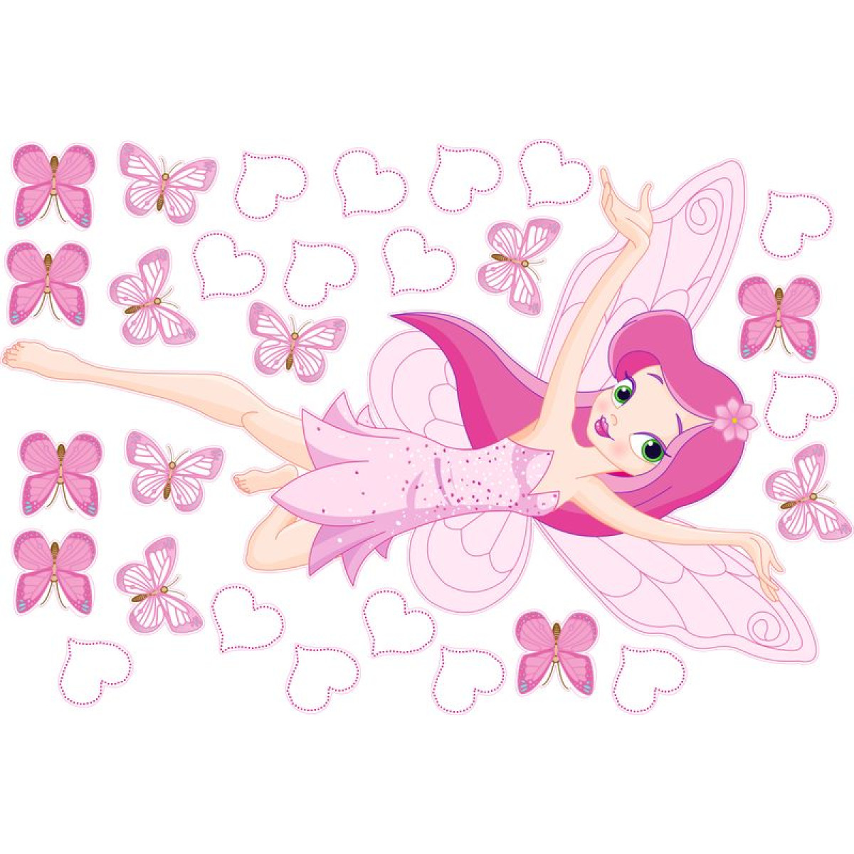 A gyerek falmatrica szett tartalma: sok rózsaszín lepke, különböző méretben és mintával, illetve 1 db pink balettozó tündér kislány