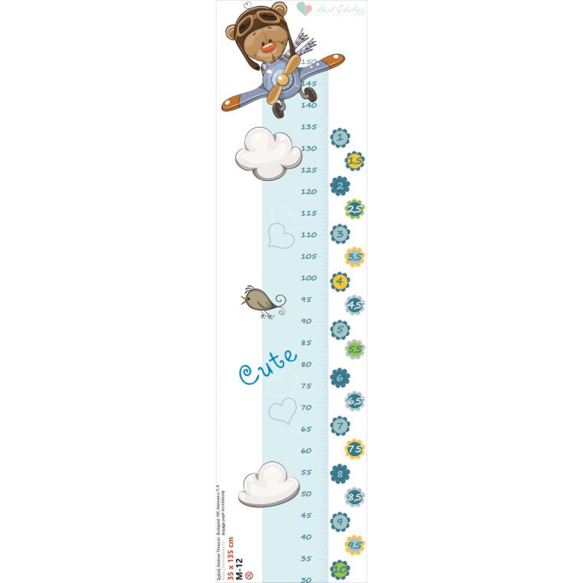 A magasságmérős falmatrica mérete 135 cm magas és 35 cm széles, ebből a mérőszalag 15 cm széles.