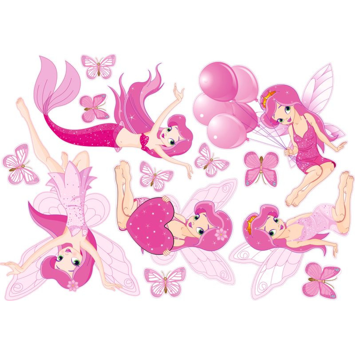 A gyerek falmatrica szett tartalma: sok lepke, különböző méretben és mintával, illetve 2 db kislány tündér ülve, 1 db álló, balettozó tündérlány, 1 db tündér lány lufikkal és 1 db tündér hableány, pink színben