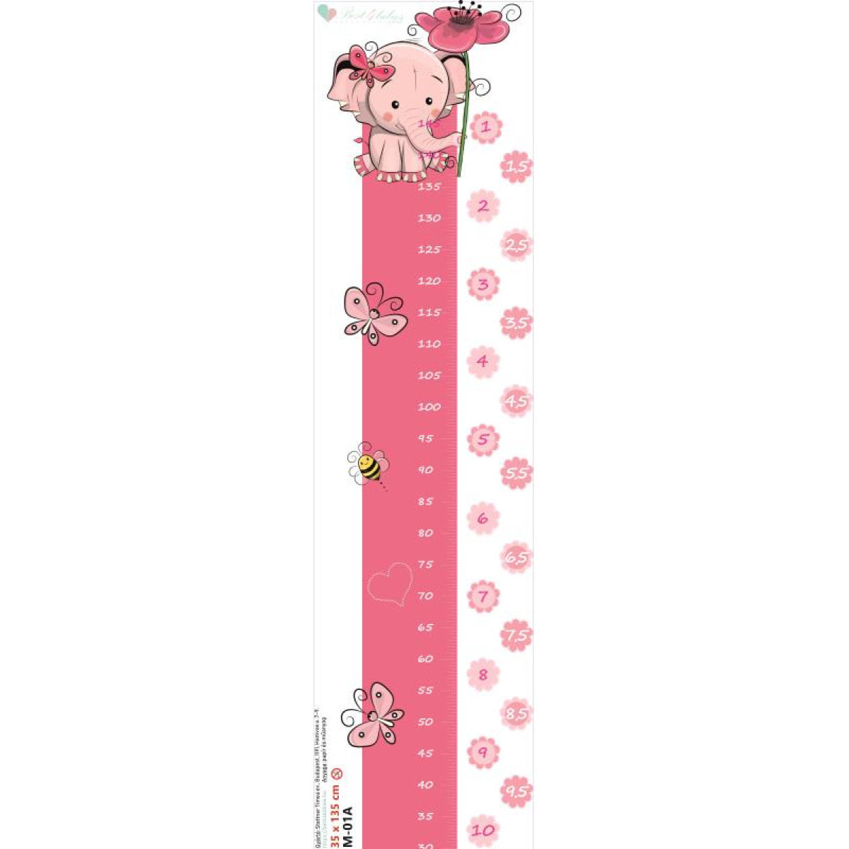 A magasságmérős falmatrica mérete 135 cm magas és 35 cm széles, ebből a mérőszalag 15 cm széles.